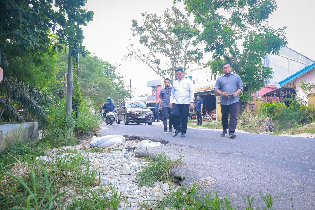PEKANBARU - Wakil Wali Kota (Wawako) Pekanbaru, Markarius Anwar meninjau kerusakan Jalan Srikandi, Kecamatan Binawidya, akibat amblas digerus air, Sabtu (14/6/2025).